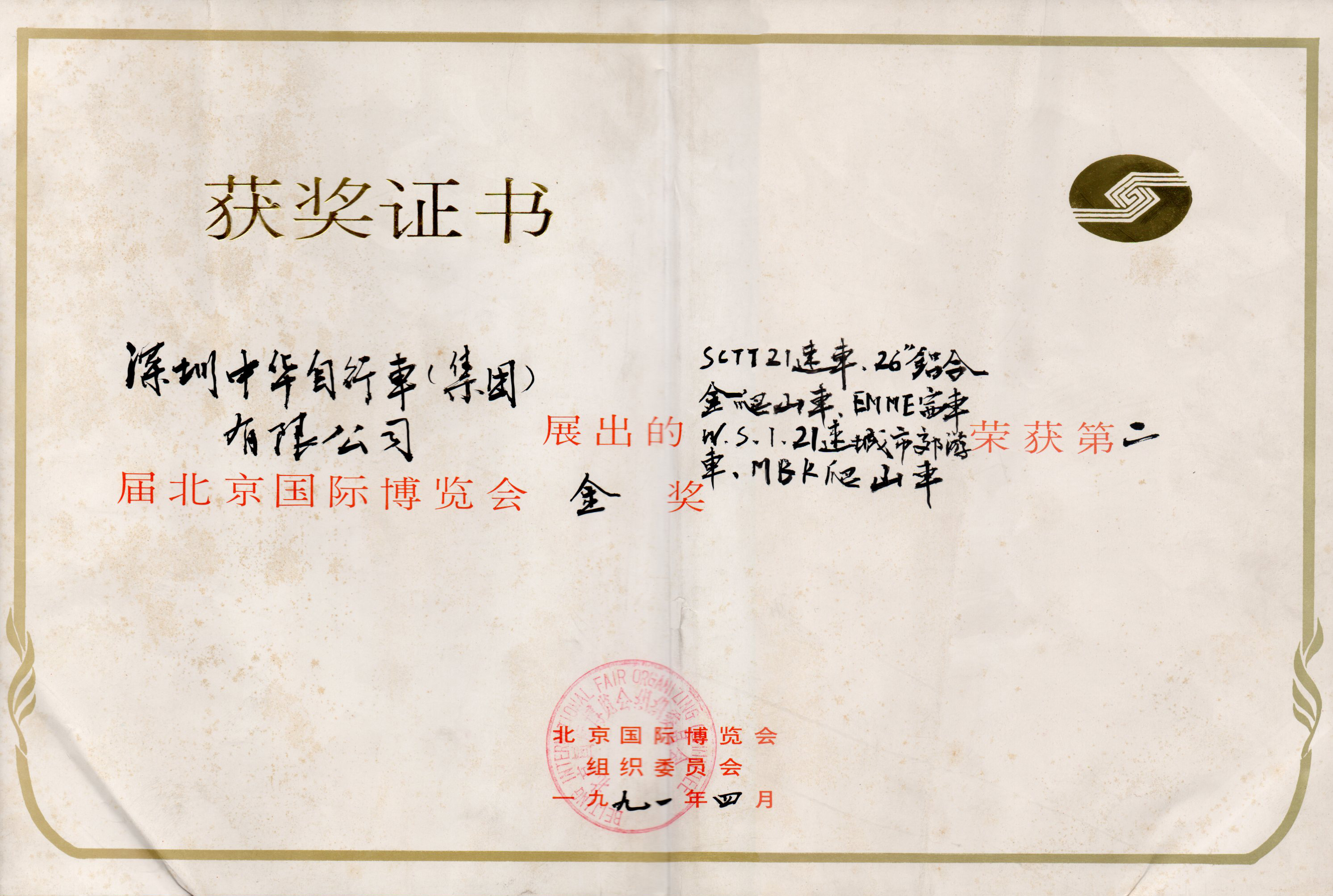 1991年,荣获 北京国际博览会组委会 授予的“第二届北京国际博览会金奖”