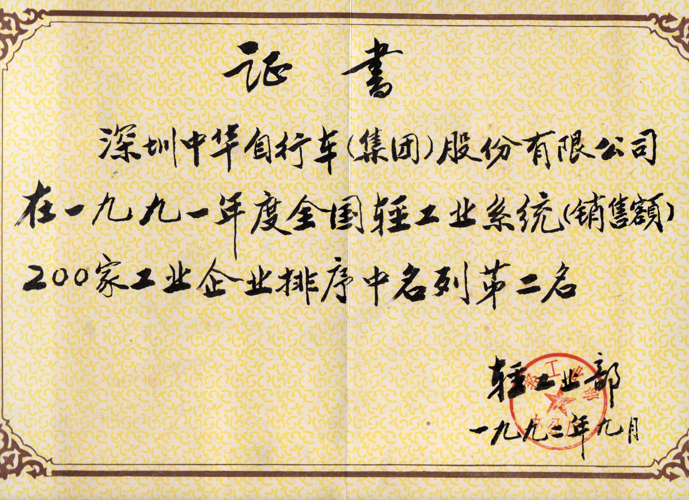 1992年,荣获 中国轻工业部 授予的“全国轻工业系统(销售额)200家工业企业第二名”