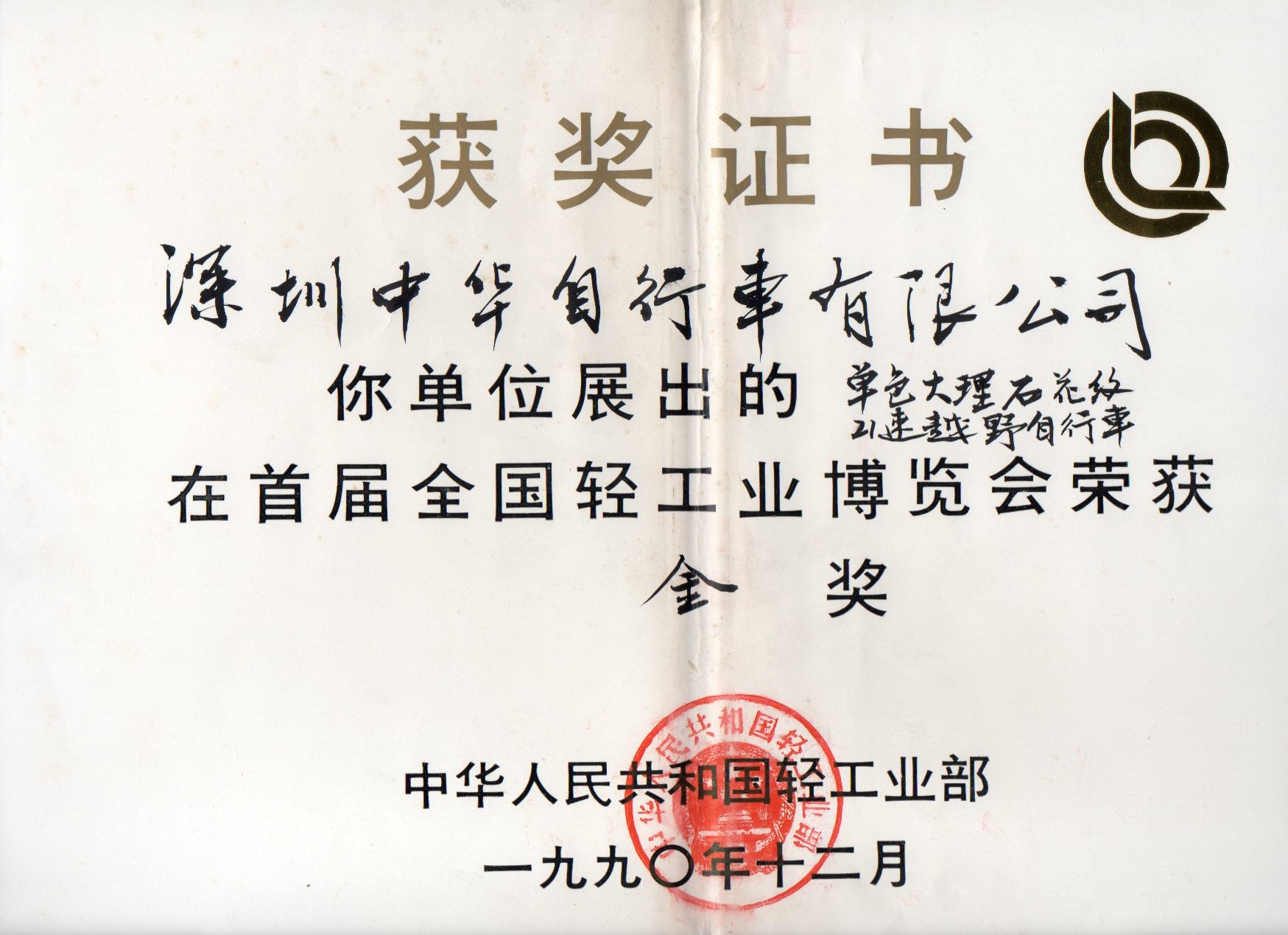 1990轻工部博览会金奖