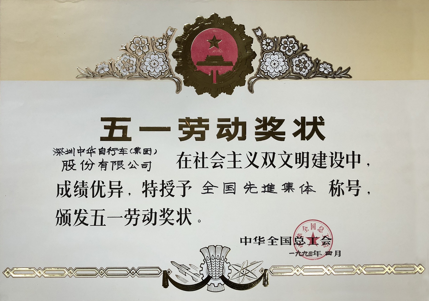 1993全国总工会五一劳动奖状